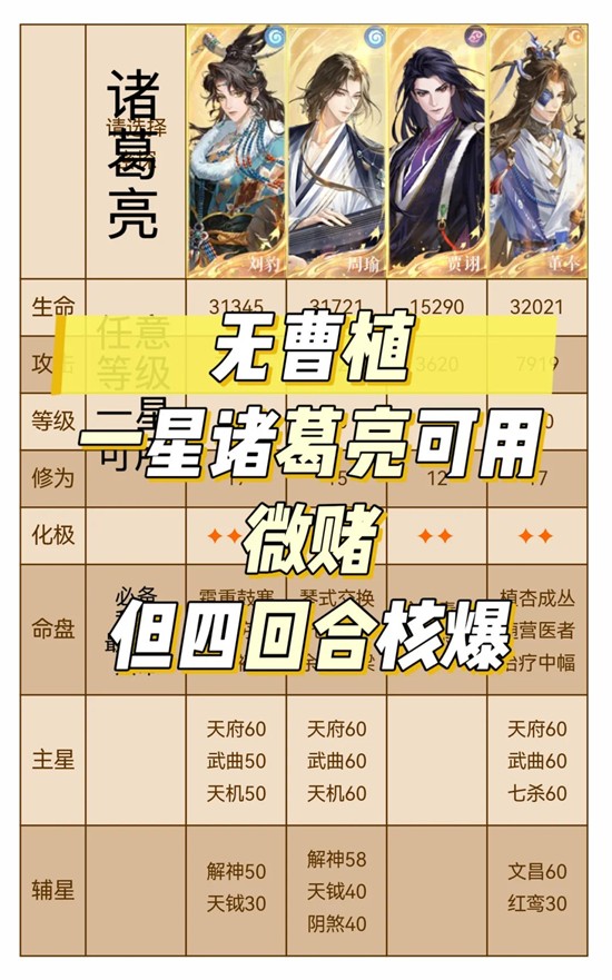 二星诸葛亮但豹瑜二星的,可以赌第四回合唤出橙星(前面需要赌出两次二星天赋的回复龙气,这个不难赌),有50%攻击力加成,轻松过关